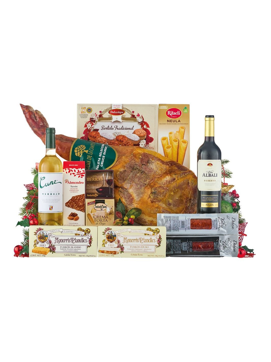 Відкрийте для себе смак Іспанії з цим ексклюзивним подарунковим набором! До складу входить витримана м'ясна палета GEMA DE LA CAMPIÑA, іберійські ковбаси, вишукані вина VIÑA ALBALI та CUNE, асорті традиційних іспанських солодощів та турронів, а також делікатесні паштети й сири. Ідеальний подарунок для справжніх гурманів!