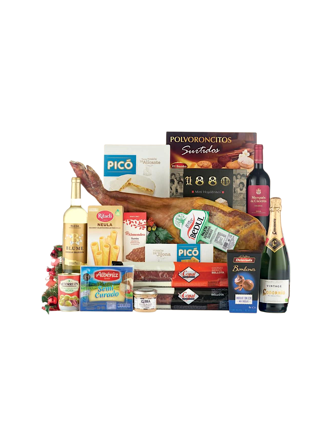 Подарунковий набір створений для поціновувачів іспанських делікатесів і містить добірні м’ясні вироби, сири, солодощі та високоякісні вина. У комплект входить хамон Serrana Duroc, іберійські ковбаси та ароматний напівтвердий сир. Солодка частина представлена турронами, хрусткими десертами та класичним іспанським різдвяним печивом. Для особливих моментів додано три види вишуканих вин. Набір доповнюють паштет із качки, оливки та декоративна подарункова коробка. Такий комплект стане ідеальним вибором для свята, корпоративного подарунка чи приємного жесту для близьких.